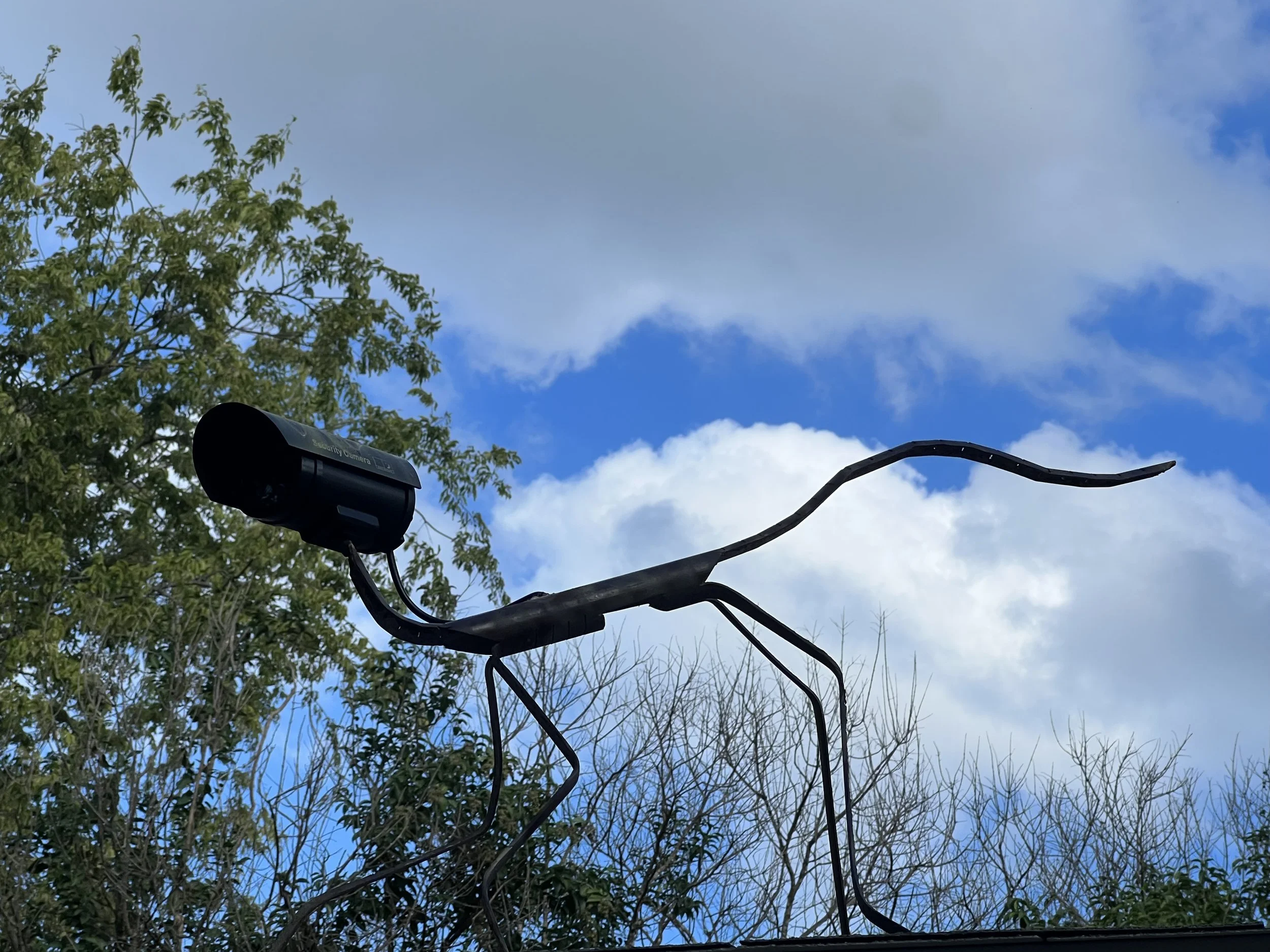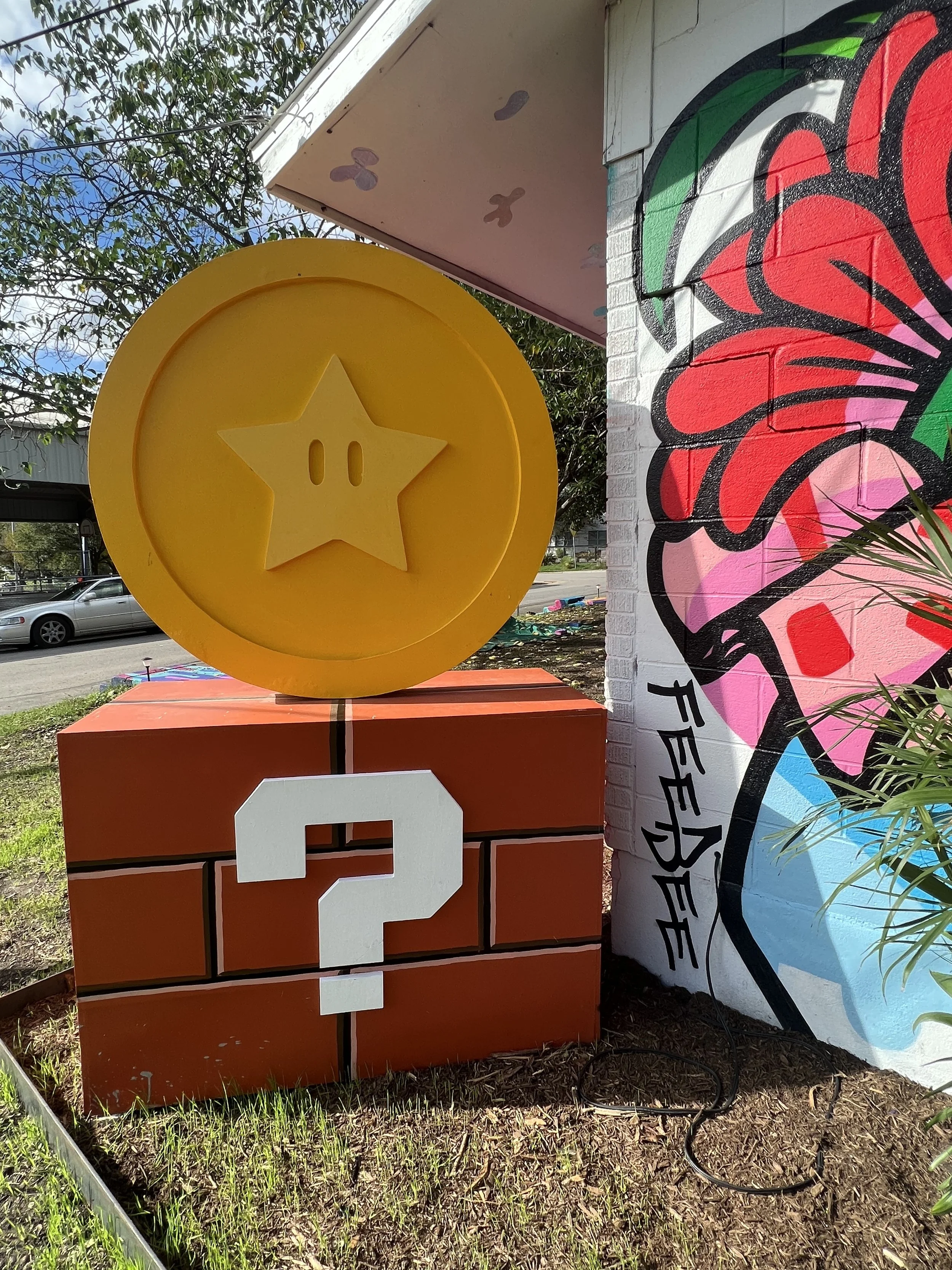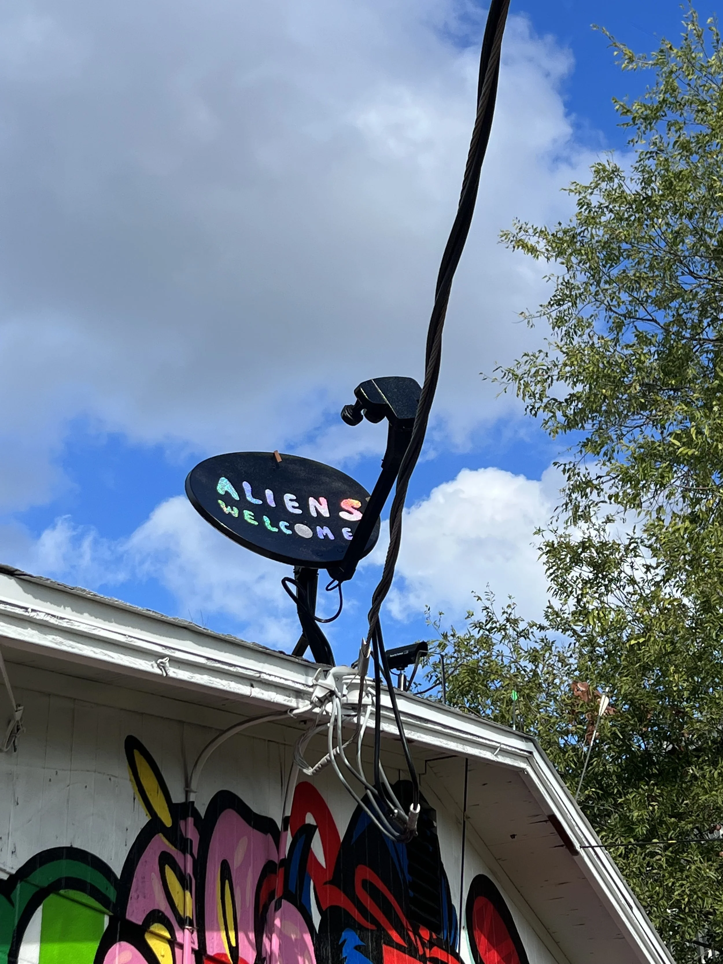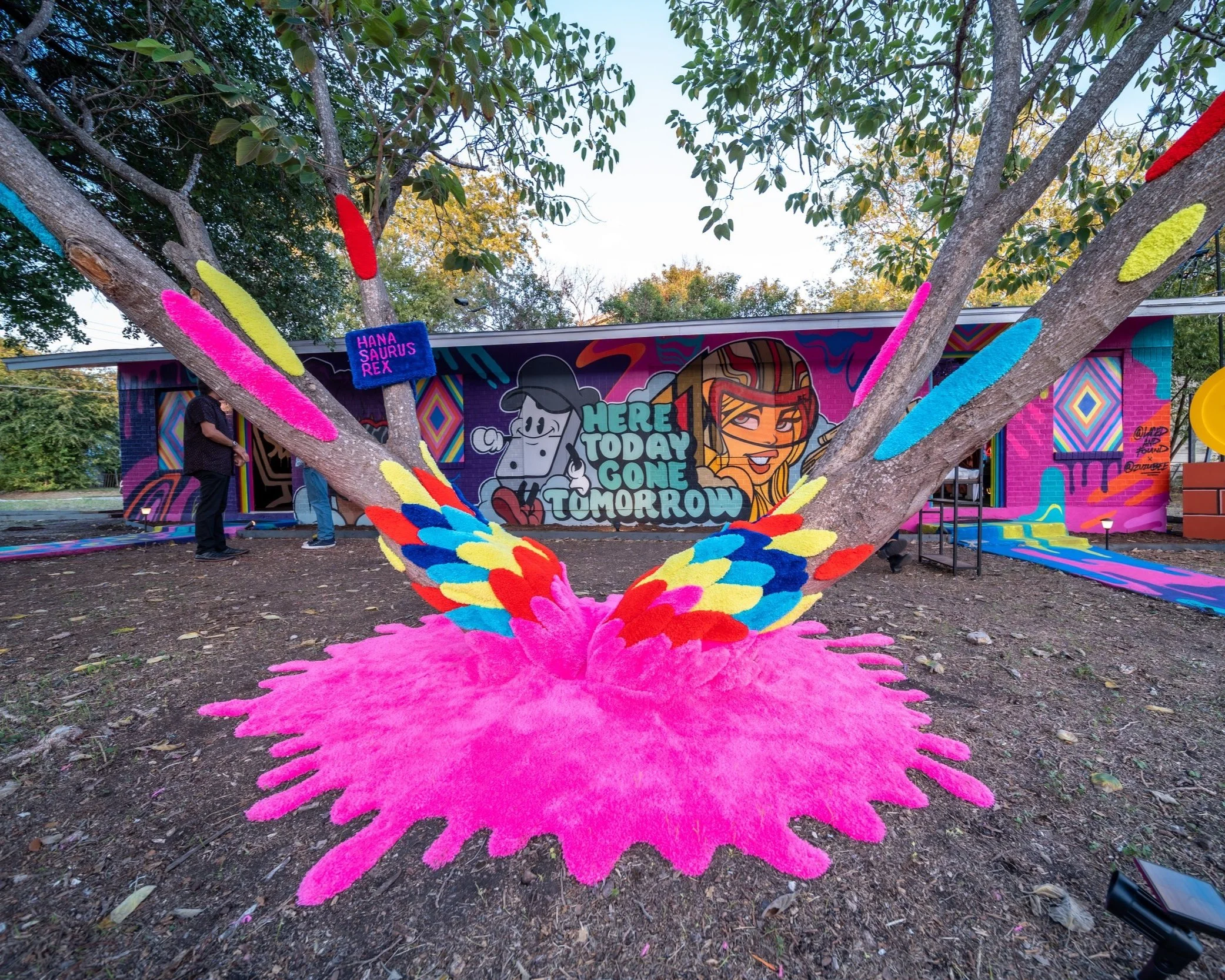 Austin's City Arborist Program helps keep Austin green by administering the City of Austin's Tree Ordinance, providing Austin with laws that protect many of our trees, and being raised in Houston, I greatly appreciate this and them. When I first came to the Here Today, Gone Tomorrow house to survey where I might be able to add something fun to its exterior space, I was immediately drawn to this tree with its two elongated trunks appearing to reach out as if longing to embrace something, someone, the sky. A dead stump and a lot of dead bark resided in its center creating two hollows that had collected much debris, and it seemed desperate for some love. I then learned that when the house is demolished, it would not be one of the saved trees but would also be, Gone Tomorrow. It was immediately decided, I am going to give this tree the glorious send-off it deserves. Playing off the concept of a Pheonix, death, and rebirth, I decided to create hand-tufted feather-shaped rugs that I hoped would appear as though the two trunks were evolving, being reborn from the earth. The rug placed around the base of the tree is meant to be a call-back to the paint adorning the walls of the house, the life's blood of many of the artists, and the newly reborn tree spilling out as it ascends, embracing its end.